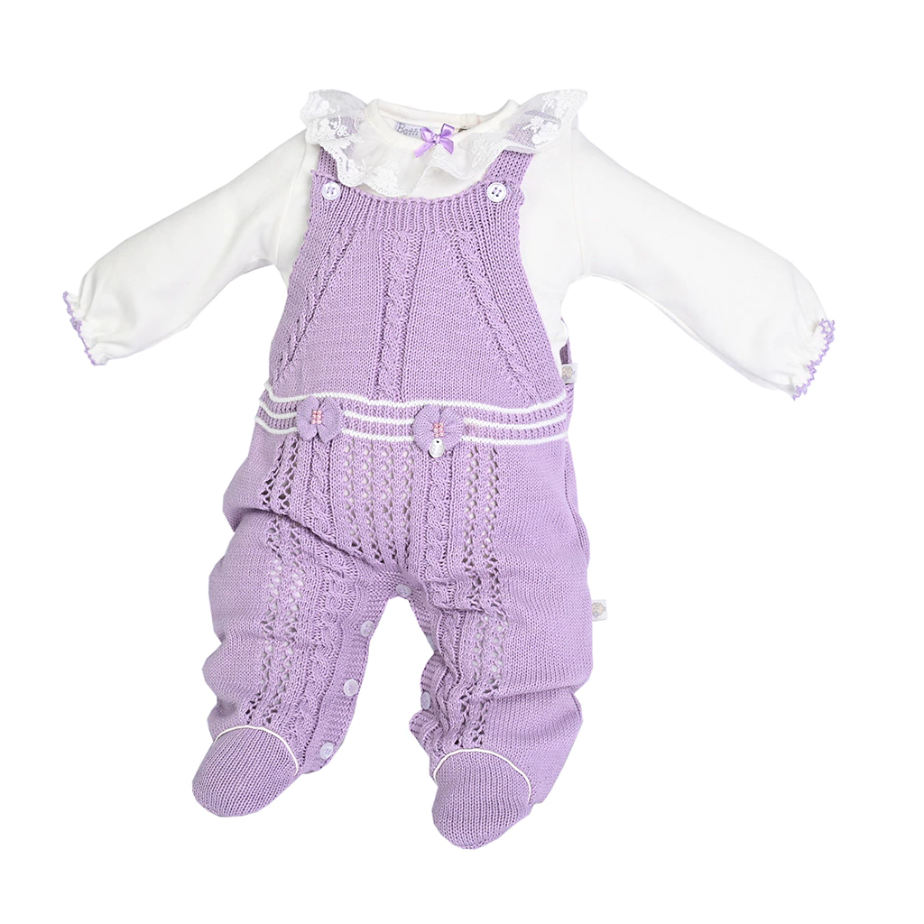 Jardineira em Tricot, abertura com botão nas alças e entrepernas com botão de pressão. Com lacinhos de tricot bordados em pérola, feitos à mão.