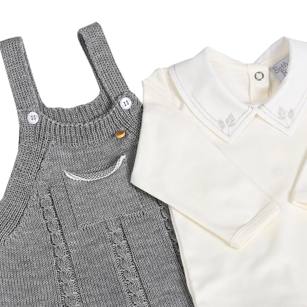 Jardineira em Tricot, abertura com botão nas alças e entrepernas com botão de pressão. Com bolso na frente.