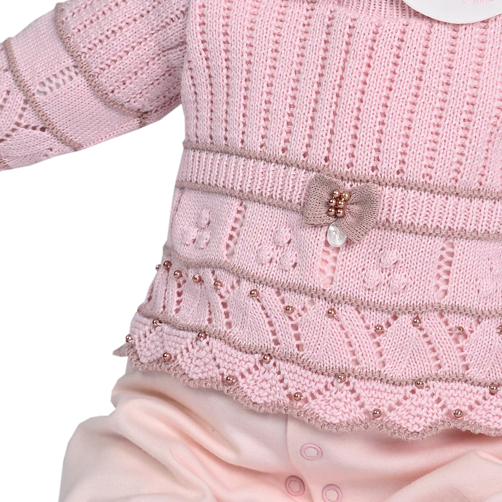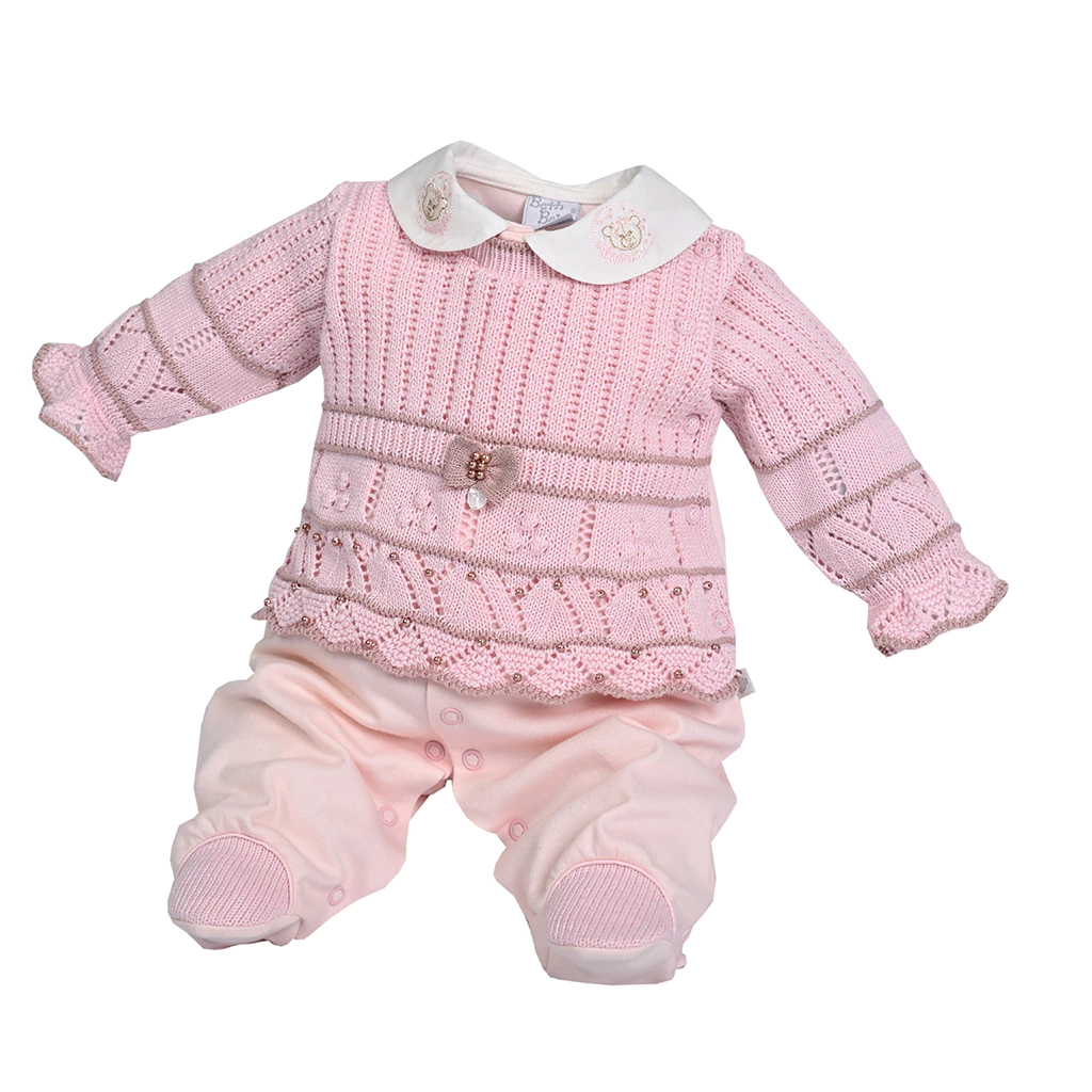 Macacão manga longa, com gola bordada em tecido 100%Algodão. Abertura frontal e entrepernas com botão de pressão. Em suedine, com sobreposição em tricot na frente do macacão e nas mangas. Bordado em pérolas, feito à mão.