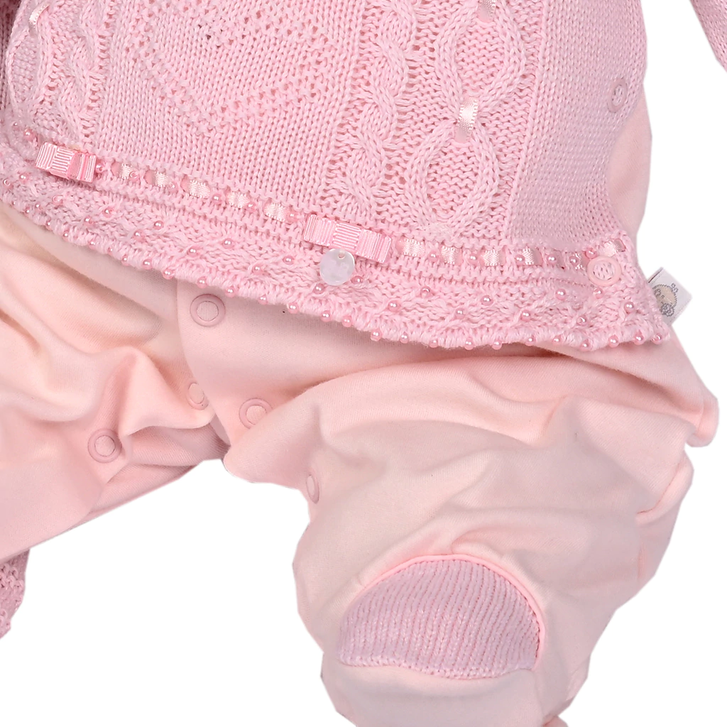Macacão manga longa, com gola bordada em tecido 100%Algodão. Abertura frontal e entrepernas com botão de pressão. Em suedine com sobreposição em tricot na frente do macacão e nas mangas. Detalhes com fita de cetim e bordado em pérolas, feito à mão. Lacinhos feitos à mão.