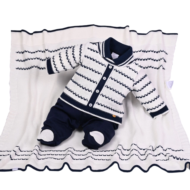 Manta de tricot em ponto trabalhado, combinando com o macacão.