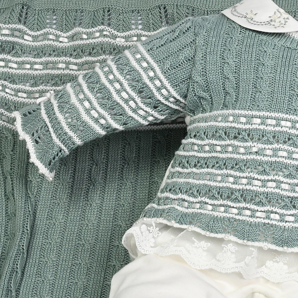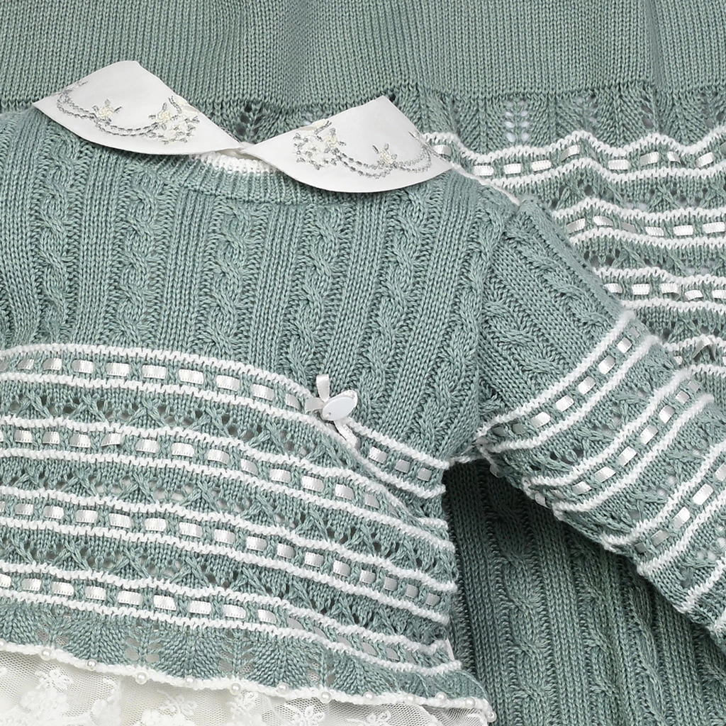 Manta de tricot em ponto trabalhado, com fitas de cetim, combinando com o macacão.